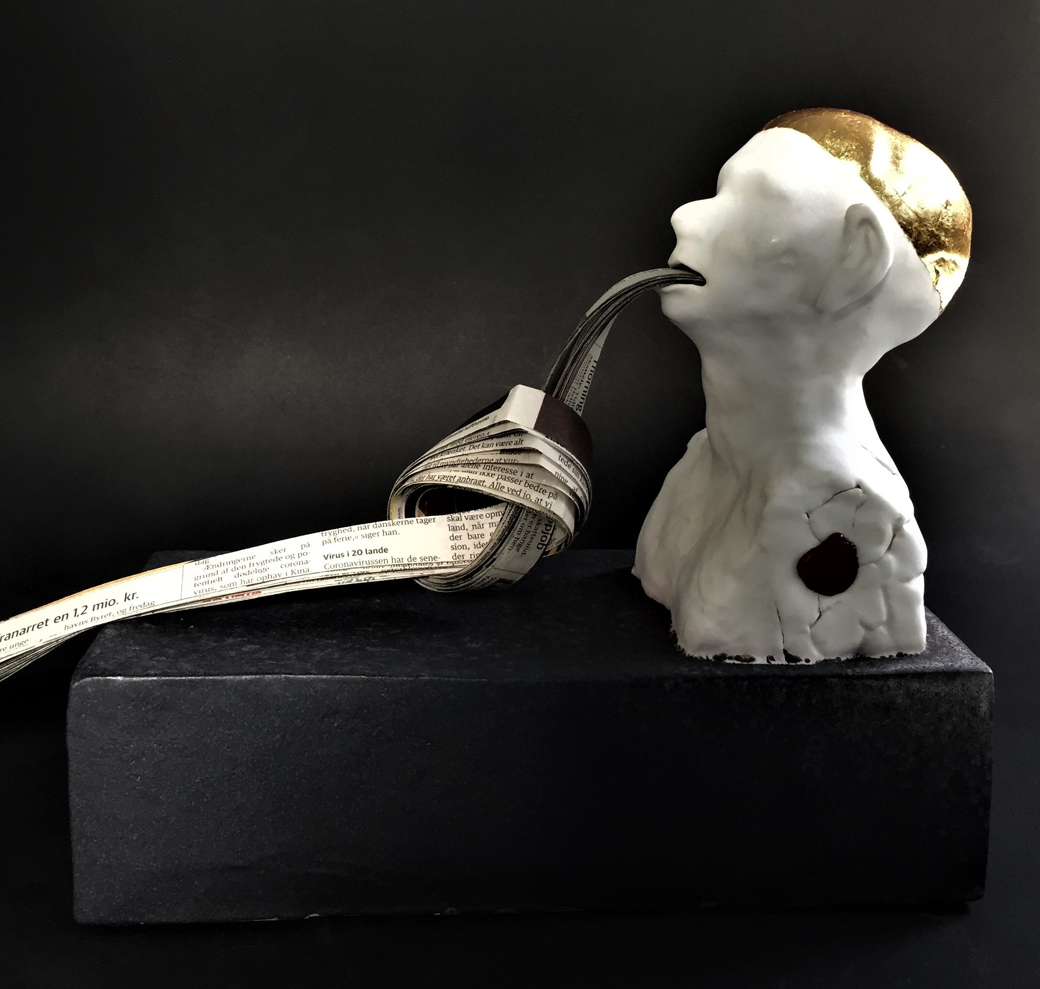 | Om værket | 'Fake News' | Stentøj, avispapir & bladguld | |